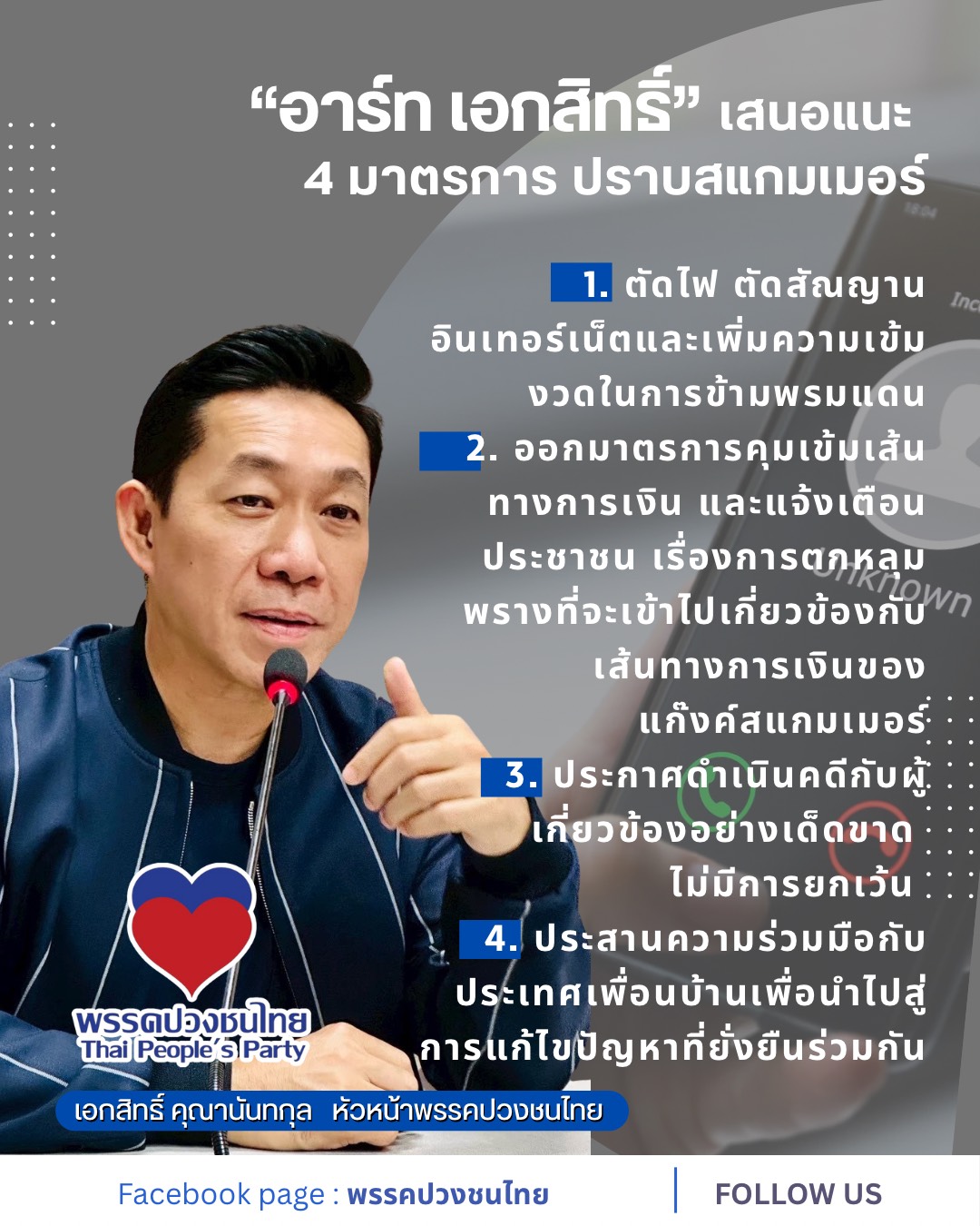 ท่ามกลางสถานการณ์ภัยคุกคามทางไซเบอร์ที่ทวีความรุนแรงขึ้นอย่างต่อเนื่อง สร้างความเสียหายต่อทรัพย์สินและชีวิตความเป็นอยู่ของประชาชน นายเอกสิทธิ์ ผู้มีพระภาค หรือ “อาร์ท” จากพรรคพลังไทย ได้ออกมาแสดงความกังวล พร้อมเสนอแนวทางแก้ไขปัญหาอย่างเป็นรูปธรรม เพื่อปกป้องคนไทยจากขบวนการมิจฉาชีพออนไลน์ หรือ สแกมเมอร์ ที่กำลังระบาดอย่างหนักในปัจจุบัน