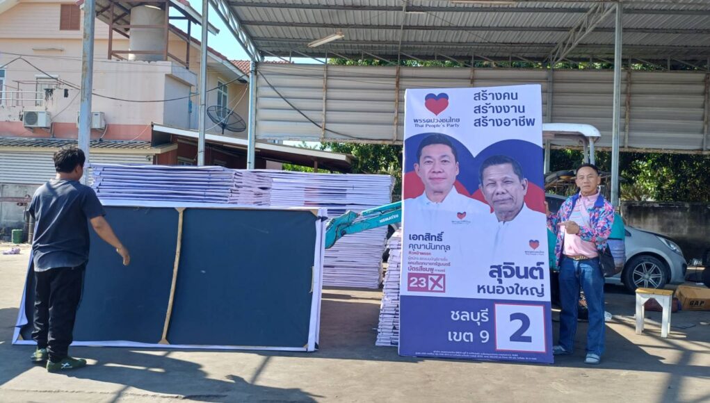 การติดตั้งป้ายนโยบายของพรรคปวงชนไทยในต่างจังหวัด